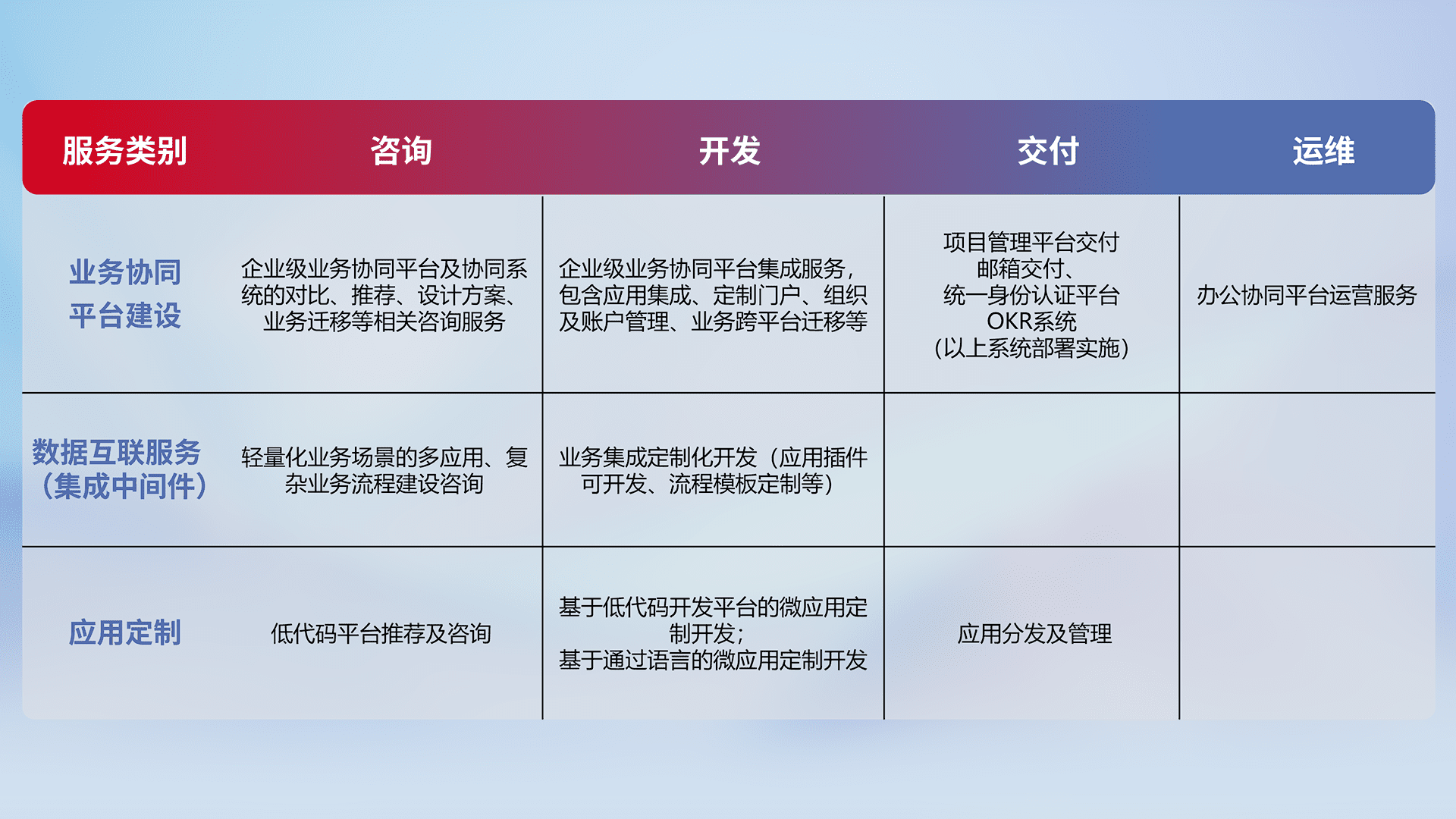 针对钉钉、、、企微、、、、IDaas等平台级产品提供产品的规划、、、方案、、、交付、、、、定制化开发等服务,,,,实现如统一协同办公、、、、智能客户服务、、、混合会议管理、、、智能数据查询、、、、等业务场景,,,,实现数字化转型。。。。