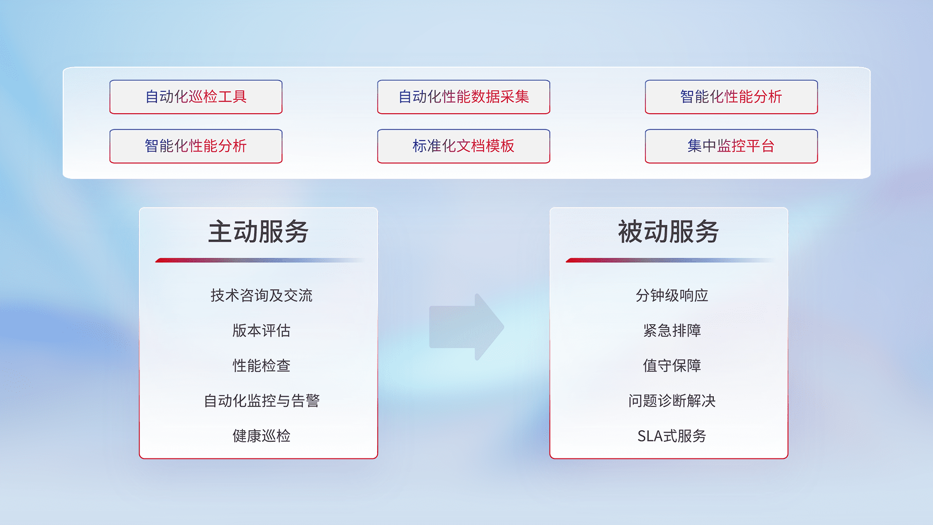 智能化工具和标准化文档,,,,保障服务质量,,,,提供主动服务(包含技术咨询、、版本评估、、、性能检查、、自动化监控与告警、、健康巡检)和被动服务包含(分钟级响应、、紧急排障、、、值守保障、、、、问题诊断解决、、、SLA服务)。。。。
